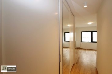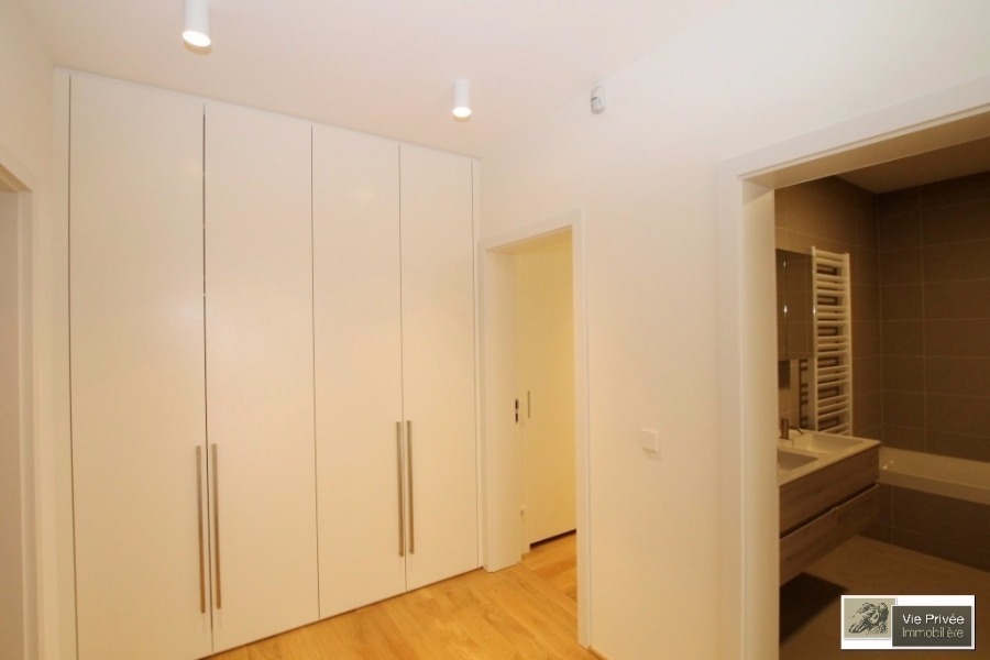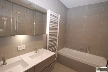 hall d’entrée avec placard, séjour de +/- 44 m2 offrant l’accès à la terrasse de +/- 16 m2, orientée sud-est et au jardin privatif, haut de gamme :cuisine bien équipée et intégrée dans le séjour, 2 chambres à coucher avec leur dressing (+/- 18 m2 chaque pièce) , salle de bains (baignoire et douche), WC visiteur